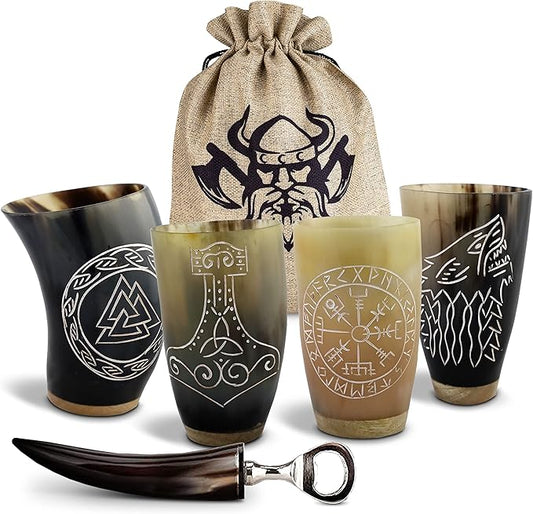 VIKING CRAFT Trinkhorn Wikinger Becher Set - 4x ca. 200ml Hornbecher + Flaschenöffner - Ideal für Wikinger Met